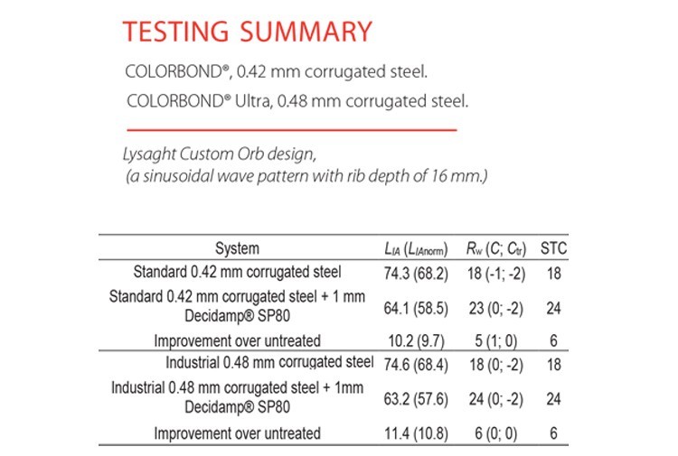 Decidamp SP80 proved to be effective in reducing rainfall noise and increasing transmission loss when applied to the lower facing of corregated metal roofing at a thickness of 1 mm (dry film thickness).